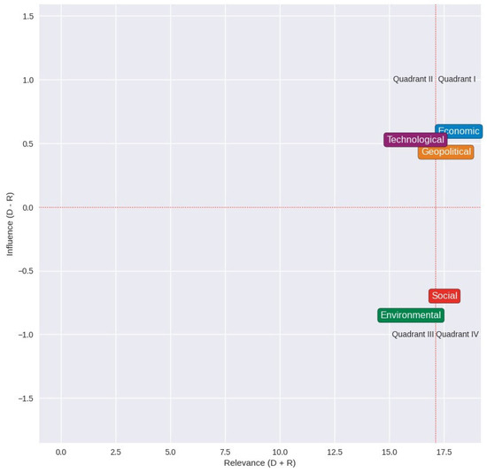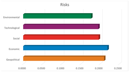 All organizational risks with a focus on sustainability described in the characterization, such as geopolitical, economic, social, technological, and environmental risks, with a positive value (D + R) are in the relevant group, whereas risks with a negative value (D − R) are in the influence group, which means that those risks are affected or influenced by other factors, adjusting to the actual conditions. Finally, the weighting matrix is created. Table 7 shows the prioritization of organizational risks with a focus on sustainability.