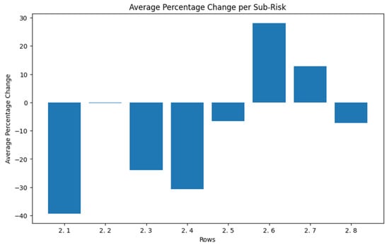 Step 2. Criteria comparison matrix (CM): The experts compared the relative importance of the criteria, in this case the characterized sub-risks (see Figure 3), and positive values were assigned in the criterion comparison matrix CM, a square matrix of size n × n. Each element CM(i,j) represents the importance relationship between criteria i and j. For example, if CM(i,j) = 3, it means that criterion i is three times more important than criterion j.