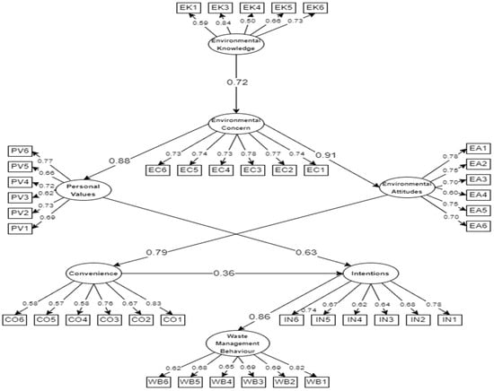 This study’s questionnaire incorporated ideas from various studies focusing on the components of the Theory of Planned Behavior. The Theory of Planned Behavior remains valuable for social and behavioral research, as shown in various studies. These studies demonstrate that the theory is still evolving and being explored, with researchers investigating factors such as perceived behavioral control and other factors that affect human behavior [37]. The questionnaire was divided into three parts: the first part was the introduction, where the researcher gave insights to the respondents about the study; the second part was the demographics of the respondents; and, lastly, the questionnaire itself, where the ten latent variables were included namely: (1) Environmental Knowledge, (2) Environmental Concern, (3) Role of Government, (4) Policy and Regulation, (5) Personal Values, (6) Social Norms, (7) Environmental Attitudes, (8) Convenience, (9) Intention, (10) Waste Management Behavior. With a Likert Scale of 1–5, 5 is the highest remarks and 1 is the lowest remarks. The set of questions was used to assess and evaluate the perceptions of the selected San Jose, Occidental Mindoro, residents regarding proper waste disposal in the community (Table 2).