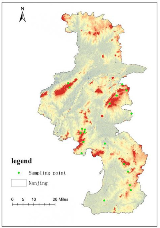 Survey map of rural homestay villages. Note: The map is based on the standard map GS (2021) 5447, downloaded from the standard map service website belonging to the National Bureau of Surveying. Mapping and Geoinformation; the base map was not modified. Green indicates the sampling points, the other colors show the terrain of Nanjing.