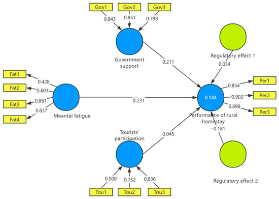We assume that the standardized path coefficient of H1—that is, the operators’ mental fatigue, which affects the performance of rural homestays—is −0.231, and its significance level p-value is 0.016 (less than 0.05). This indicates that the mental fatigue of rural homestay operators has a highly significant relationship with the homestay performance. This further indicates that managers’ mental fatigue affects the rural homestay performance. Suppose the path coefficient of H2, that is, the government support adjusted for the influence of mental fatigue on the performance of rural homestays, is 0.034, and the p-value is 0.623 (greater than 0.05). This indicates government support’s inability to alleviate the influence of mental fatigue on performance, and there is no moderating effect. However, the p-value of the significance level of government support’s direct effect on rural homestays is 0.005, which is significant at the 5% level. This value indicates that government support can directly and powerfully affect rural homestay performance without indirect means. Suppose that the path coefficient of the moderating effect of tourist participation in relation to H3 is −0.181, and the p-value is 0.030, which is significant at the 5% level. This indicates that tourist participation’s moderating effect weakens mental fatigue’s negative influence on the performance of rural homestays. The p-value of the direct effect of tourist participation on rural homestay performance is 0.630 (greater than 0.05), indicating the indirect tourist influence on rural homestay performance.
