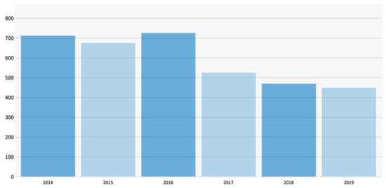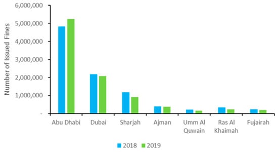 Figure 2 illustrates the road fatalities in the UAE from 2014–2019. The statistics show that the death rates kept dropping from 2017 to 2019. Nevertheless, the number of road accidents and serious injuries in the UAE is still high and these are mainly caused by the incorrect behavior of drivers [], which will be discussed in the following section. Similarly, the total number of issued traffic fines has been reported for all the emirates for 2018 and 2019 []; these statistics are illustrated in Figure 3. It can be seen that the number of fines has decreased in all emirates except for Abu Dhabi, where there was an increase of approximately 9%.