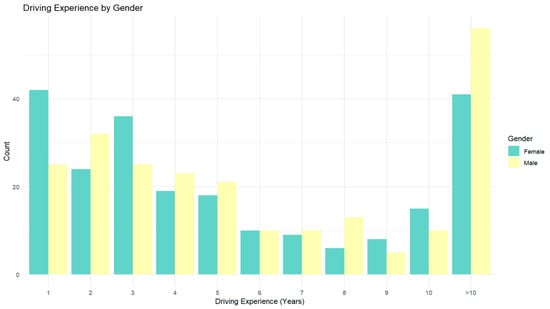 For the collected data, male and female respondents were almost equal, which enables multiple unbiased comparisons between the gender categories; the results show that men get traffic tickets/fines more than women, while the latter have higher rates of traffic accidents in the UAE, as illustrated in Figure 6. For driving experience, Figure 7 reveals that men have relatively more years of driving experience in the UAE.