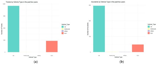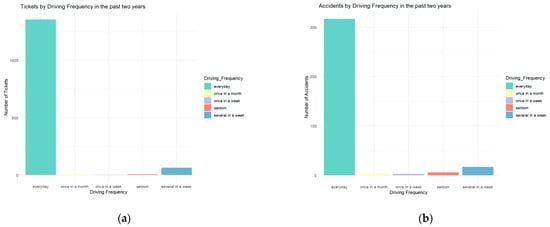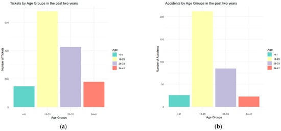 Demographic variables such as gender, age, driving experience, education level, etc., have an effect on driving behavior and traffic violations (e.g., [,,,]). Globally, younger individuals are found to be at a higher risk of being involved in traffic crashes, and the same holds true for older individuals with increased years of driving experience (e.g., [,,,]). Regarding gender differences, Gonzalez-Iglesias et al. [] observed that men tend to have a higher frequency of traffic fines and are more prone to committing traffic violations than women. On the other hand, Horvath et al. [] observed that women tended to drive less than men and had a lower incidence of offenses. Akaateba et al. [] found that traffic violations increased with driving experience. Additionally, drivers with higher levels of education exhibited a lower frequency of traffic violations.
