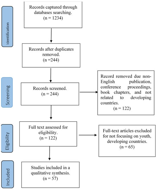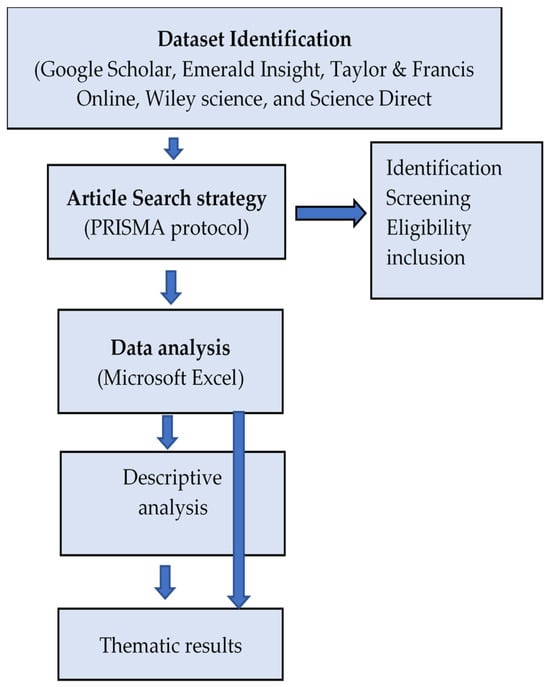 We followed the Preferred Reporting Items for Systematic Reviews and Meta-Analyses (PRISMA) protocol for conducting a systematic review [37]. PRISMA is an iterative procedure comprising a four-phase flow diagram and a 27-item checklist. It is a widely recognized framework that facilitates the conduct and reporting of systematic reviews [37]. It offers a well-organized method to guarantee the review process’s openness, reliability, and quality [37]. The PRISMA statement allowed for a search for phrases associated with youth participation in agriculture in Africa. Hence, the review methodology is structured around three distinct phases: dataset identification, article search technique, and data processing, as seen in Figure 1.