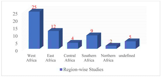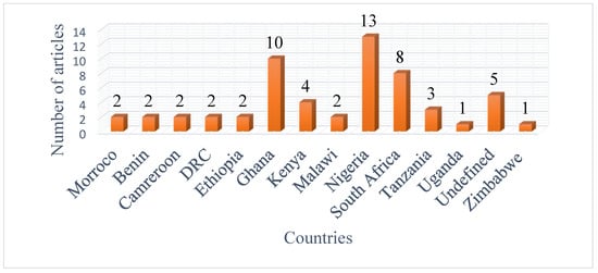 The distribution of the country-wise studies is presented in Figure 5. The findings showed that most studies (13) were conducted in Nigeria, which can be attributed to the country’s large population and significant agricultural sector. Ten of the total sample studies were from Ghana. Around eight articles were from South Africa. These findings suggest that Nigeria, Ghana, and South Africa were the countries with many studies on youth participation in agriculture in sub-Saharan Africa. Four articles were published in Kenya and three in Tanzania. Only one study was found in Uganda and Zimbabwe, while [6,7,42,43,44] studies were not specific to any country. This could be attributed to the nature of the survey because three of these studies were review articles, and one was a research article. In addition, it was observed that there are limited studies in other African countries. Therefore, future researchers need to explore these areas.