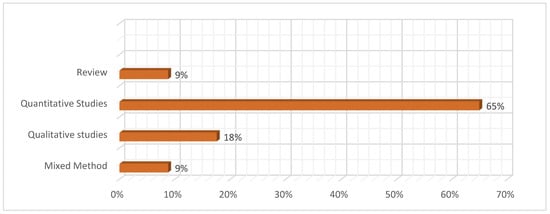 Figure 7 presents an overview of the research methodologies used in the 57 included articles, offering insight into the methods and techniques employed by researchers in this field. The results revealed that the majority (65%, 37) of the research articles were quantitative research. Of the 57 studies, ten (18%) applied qualitative research techniques. Qualitative research typically involves collecting non-numerical data through interviews, focus groups, and observation and then analyzing those data to find themes and patterns. The results also show that five of the included articles were review articles that synthesize and summarize the findings of multiple studies on a particular topic. The review and mixed method were the least explored, with only five articles each. This suggested that there is a need for more studies in this direction. Mixed-methods research can provide a more comprehensive and nuanced understanding of a particular phenomenon, allowing researchers to collect numerical and non-numerical data and analyze it in several ways.