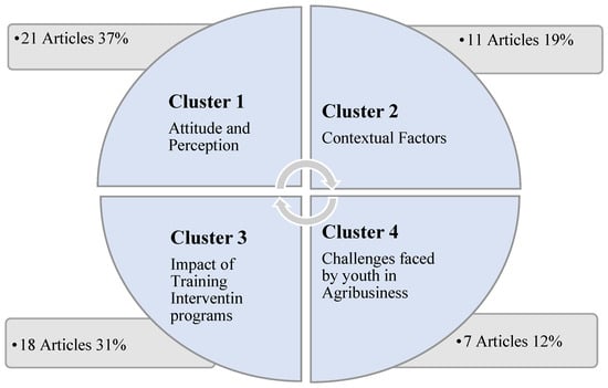 Following Social Cognitive Theory, we have identified 57 articles and categorized them into four clusters based on their similarities in content. Of the 57 studies reviewed, 21 articles (37%) concentrated on the perception and interest of young people in pursuing agribusiness as a career (Attitude and Perception—cluster 1). A total of 11 studies, representing 19%, focused on the factors that affect youth engagement in agribusiness (Contextual Factors—cluster 2). Around 31% (equivalent to 18 publications) focused on analyzing the impact of intervention programs on the involvement of young people in agriculture (Impact of Training Intervention—cluster 3). Seven articles (12%) presented findings on the challenges that hinder young people from engagement in agribusiness (Challenges faced by youth in agribusiness—cluster 4). The identified themes were analyzed using content analysis. This methodology proves valuable in examining patterns, content understanding, and meaning interpretation [45,46]. To reduce biases, two authors independently read the 57 articles used in this study and classified these studies into four major clusters, as illustrated in Figure 8 and Table A1 (refer to Appendix A).