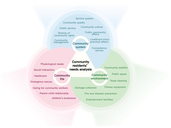 Based on these interview results and previous research [4,5,6,24], the needs of the residents roughly comprised three aspects: community life, community system, and community environment (see Figure 4).