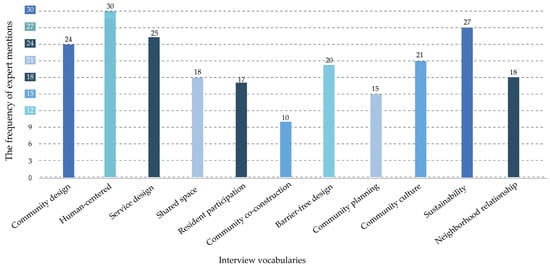 We drew a word frequency count based on the interviews with the experts. Our results showed that “human-centered”, “sustainability”, “service design”, “community design”, “resident participation”, and “barrier-free design”, among others, were mentioned repeatedly (Figure 5).