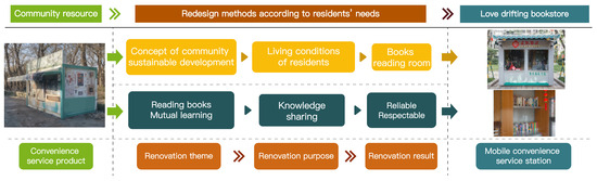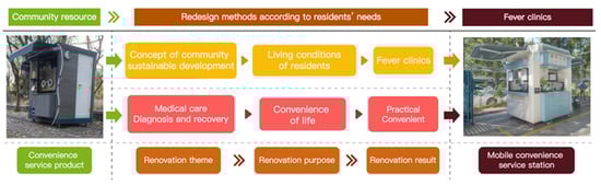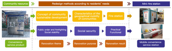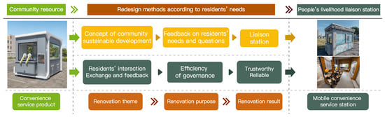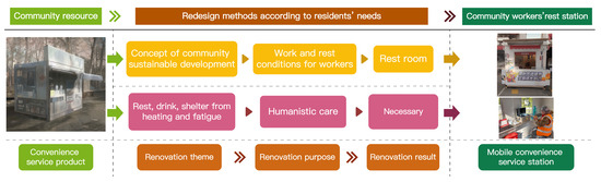 A large number of abandoned nucleic acid testing booths in the communities needed to be redesigned and renovated according to the actual needs of the community residents using, for example, the concept of sustainable development of the community, the needs of the community residents, community empowerment, future design, and the design methodology, so as to create mobile convenience stations that could satisfy the needs of the residents in the community and the sustainable development of the community in the future (as shown in Figure 3) [45,46,47]. The themes of the renovations of the nucleic acid testing booths corresponded to the concept of sustainable development, future design, and the future strategies of the communities. The purpose of the renovations corresponded to the needs of the residents and the design of the community services, which were organized and practiced by and included the participation of multiple parties. The results of the remodeling were the cultivation of the community, design direction, and the application of the design methodology. The needs of community residents exist in different categories and levels and require the application of different design methods to solve their problems [45,46]. The applied design methods tailored to the residents’ needs included functional design, safety design, experiential design, human-centered design, emotional design, fun design, and unconscious design. Design methods that are environmentally friendly for communities include green design, sustainable design, low-carbon design, and energy-saving design. Design methods that emphasize community system construction are system design, interdisciplinary design, sustainable design, service design, among others [46,47].