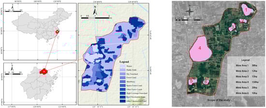 The study area is located in Haining City, Zhejiang Province (30° N, 120° E), with a total land area of 951.49 hectares (Figure 1). The area comprises several mining pits, each with varying sizes: Pit 1: 38 hectares, Pit 2: 12 hectares, Pit 3: 15 hectares, Pit 5: 20 hectares, and Pit 6: 10 hectares. Notably, Pit 4 covers a larger area, spanning 150 hectares. The study area, situated in Yuanhua Town, experiences distinct seasons with similar water and temperature patterns. Via on-site inspections, it was discovered that the landscape in the study area is rich and diverse, encompassing water bodies, paddy fields, forests, shrubs, sparse woodlands, other wooded areas, high-cover grasslands, rural residential areas, and other developed lands, exhibiting promising prospects for construction and substantial development potential (Figure 1). The remnants in this region include geological landscape mining relics, industrial production area mining relics, intangible cultural relics, and village-style relics. This area holds significant aesthetic, observational, research, exploration, and historical–cultural value [].