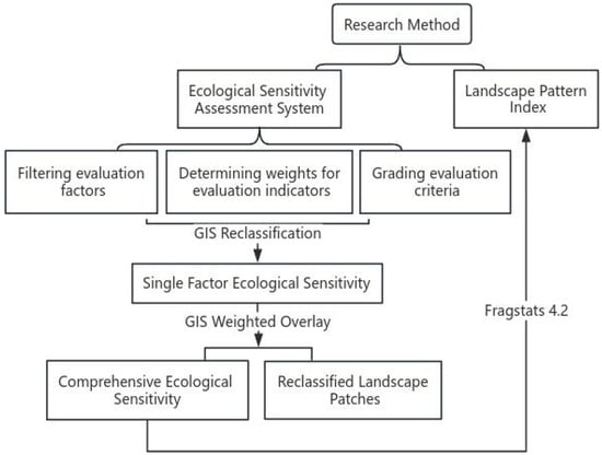 This article adopts a research method that combines ecological sensitivity assessment with landscape pattern index. Firstly, an ecological sensitivity assessment system for abandoned mining land is established. Using a literature review method, ecological sensitivity assessment indicators for abandoned mining land are selected. Using the Delphi method (expert questionnaire survey), weights for the ecological sensitivity assessment indicators of abandoned mining land are obtained. According to the actual situation, the evaluation criteria for evaluation factors are graded. Secondly, ecological sensitivity assessment data for abandoned mining land are obtained. The selected evaluation factors are reclassified and analyzed using GIS 10.8 software to obtain single-factor ecological sensitivity data. By using a multi-index weighted overlay method, an analysis of ecological sensitivity for the entire study area is obtained. Finally, the comprehensive ecological sensitivity data and reclassified landscape patch data are input into Fragstats 4.2 to calculate landscape pattern indices. By comparing landscape pattern indices and ecological sensitivity data, the relationship between them is explored, and conclusions are drawn (Figure 2).