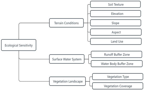 Drawing insights from the relevant literature, specific factors related to terrain, soil, and climate were identified [,,,,,,,,,]. The intermediate layer of abandoned mining land is divided into topographical conditions, surface water systems, and vegetation landscapes. On one hand, the topography of abandoned mining land is unique, requiring the consideration of factors such as elevation, slope, aspect, land use, and other evaluation factors. On the other hand, abandoned mining land experiences severe ecological damage, with vegetation being the most affected. Therefore, it is necessary to investigate factors such as vegetation coverage and vegetation types. In the research area, the prominent feature of abandoned mining land is water accumulation forming a lake, which makes the surface water system a decisive factor. Initial screening resulted in 56 assessment factors across terrain conditions (Table 1), surface water systems (Table 2), and plant landscapes (Table 3) []. After eliminating duplicates, 9 factors remained. Applying the Delphi method for questionnaire selection, quantified scoring was conducted on the factors influencing the initial selection set. The extracted influencing factors were then subjected to secondary selection. The process involved integration, refinement, and other enhancement steps for comprehensive improvement. Considering the current site conditions, the final factors closely related to ecological sensitivity suitability were identified as elevation, slope, aspect, soil texture, land use, runoff buffer zone, water body buffer zone, vegetation coverage, and vegetation type (Figure 3).
