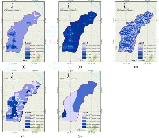Sensitivity assessment of terrain conditions. (a) Elevation sensitivity assessment. (b) Slope sensitivity assessment. (c) Slope orientation sensitivity assessment. (d) Land use sensitivity assessment. (e) Soil texture sensitivity assessment.