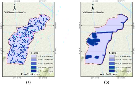 Surface water sensitivity assessment. (a) Runoff buffer zone sensitivity assessment. (b) Water buffer zone sensitivity assessment.