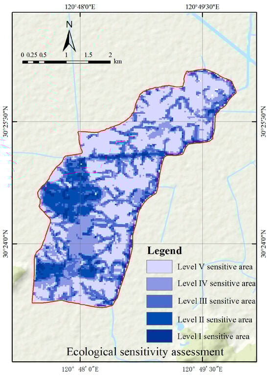 Ecological sensitivity refers to the extent to which an ecosystem responds to external pressures, disturbances, or changes, encompassing both the sensitivity of the ecosystem to environmental changes and its capacity for recovery and adaptation []. It includes factors such as biodiversity, ecological balance, and ecosystem functionality to assess an ecosystem’s resistance and adaptability to different pressures [,,]. This concept is crucial in environmental management and conservation, aiding in the formulation of sustainable development strategies and measures. In comparison to ecological suitability, the former emphasizes rigid protection and sustainable development, while the latter emphasizes moderately developing the site []. Therefore, after obtaining the results of the ecological sensitivity assessment, it is necessary to convert them to the conventional land suitability assessment results. The regions with the highest ecological sensitivity are defined as unsuitable for development, while the regions with the lowest ecological sensitivity are defined as suitable for development [].