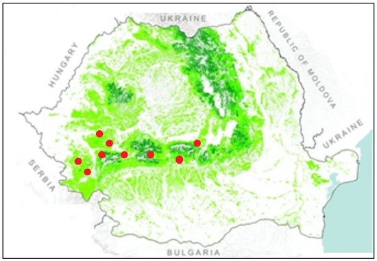 The largest areas of uneven-aged forest stands in the Romanian Southern Carpathians (red dots on Figure 3) are located in the forest districts of Domnești (3226 ha), Retezat (1611 ha), Latorița (1498 ha), Brezoi (982 ha), and Râșnov (893 ha; located in the eastern region). The largest areas of uneven-aged forest stands in the Banat Mountains are located in the forest districts of Mehadia (2175 ha), Caransebeș (1530 ha), Dobra (801 ha), and Hunedoara (578 ha).