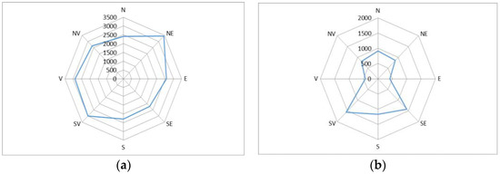 As expected, the largest number of uneven-aged forest stands of spruce, fir, and beech in the Southern Carpathians are located on the shaded and partially shaded expositions in the northeast and north. Conversely, the largest number of uneven-aged stands of beech and fir is situated on the southwestern expositions, where the conditions necessary to grow these species are optimal (Figure 4).