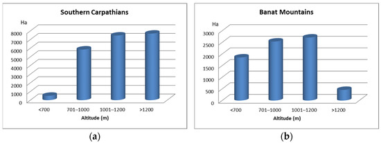 The altitude of the land corresponding to (a) uneven-aged forest stands in the Southern Carpathians and (b) the Banat Mountains.