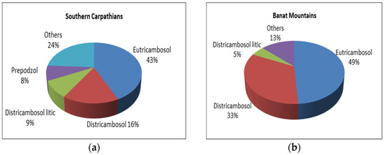 We detected no significant differences in soil types between the studied areas. The dominant soil types in the Southern Carpathians and Banat Mountains are eutric cambisols (43% and 49%, respectively) and dystric cambisols (25% and 38%, respectively) (Figure 7).