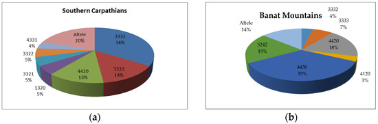 Analysis of the distribution of forest stations in uneven-aged stands from the two Carpathian sectors revealed that the Banatului Mountains is dominated by ‘Mountain-premountain common beech of superior reliability, eutricambosoil, high edaphic with Asprula-Dentaria’ (35%), followed by ‘Hill common beech of average reliability, average edaphic eutricambosol with Asperura-Asarum’ (19%) and ‘Mountain-premountain common beech of average reliability, average edaphic eutricambosol with Asperula-Dentaria’ (18%) (Figure 8).