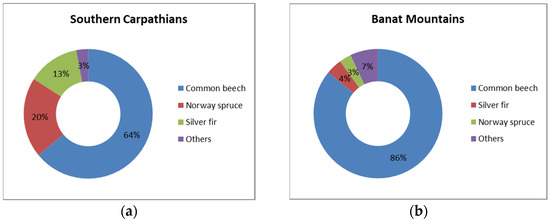 The species most representative of the uneven-aged forest stands in the two studied areas are beech (13,803 ha), spruce (4304 ha), and fir (2864 ha) for the Southern Carpathians, and beech (6534 ha), fir (295 ha), and spruce (201 ha) for the Banat Mountains (Figure 9).