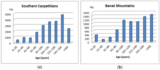 The majority of uneven-aged forest stands in the Romanian Southern Carpathians are more than 80 years old, with stands aged 141–160 years, 121–140 years, and 101–120 years occupying 4805 ha, 3684 ha, and 3584 ha, respectively. We noted a similar situation in the Banatului Mountains, where most of the uneven-aged forest stands were older than 80 years. Stands aged 81–100 years, 141–160 years, and more than 160 years occupied 1163 ha, 1353 ha, and 1470 ha, respectively.