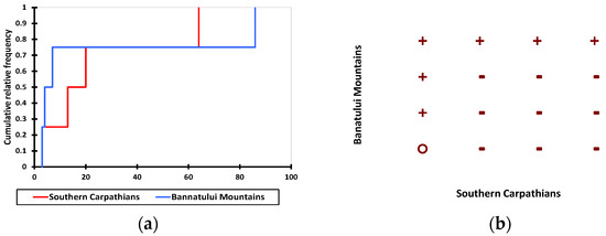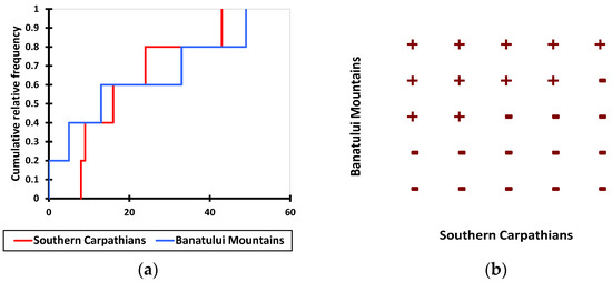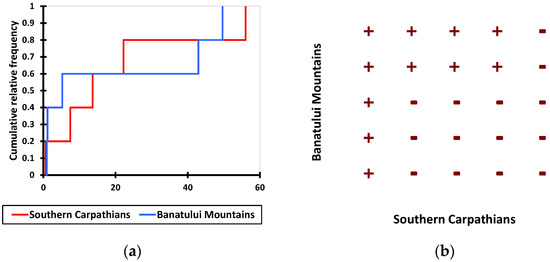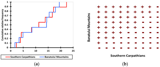 Graphical results from nonparametric test comparison (Kolmogorov-Smirnov, p = 0.05) between proportions distributions of the altitude of the land corresponding to uneven-aged forest stands in the Southern Carpathians and the Banat Mountains. (a) cumulative distributions, and (b) dominance diagram.