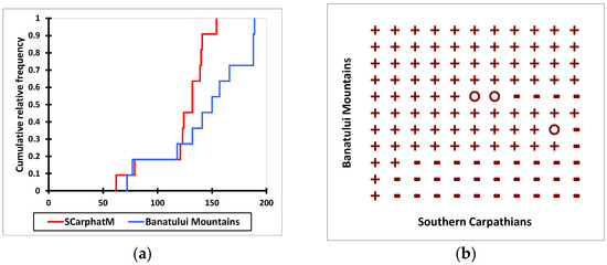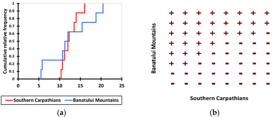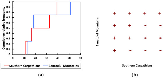 Graphical results from nonparametric test comparison (Wilcoxon signed-rank test, p = 0.05) between distributions of the volume of common beech (m3) from uneven-aged stands of pure common beech located in the Southern Carpathians compared with Banatului Mountains. (a) cumulative distributions and (b) dominance diagram.