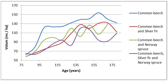 Based on their composition, the volume of common beech in uneven-aged stands is decreasing in the following order: stands of common beech only, stands of common beech mixed with Norway spruce, stands of common beech mixed with fir, and lastly, stands of common beech mixed with fir and Norway spruce (Figure 22).