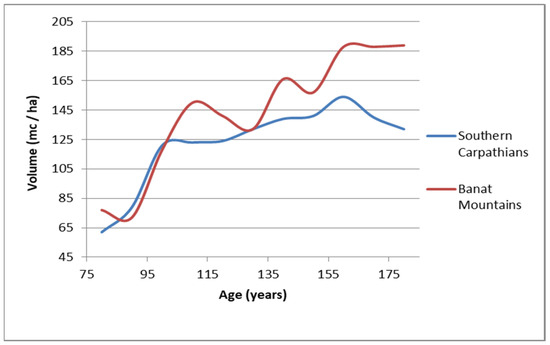 The volume of common beech (m3) from uneven-aged stands of pure common beech located in the Southern Carpathians compared with the Banatului Mountains.