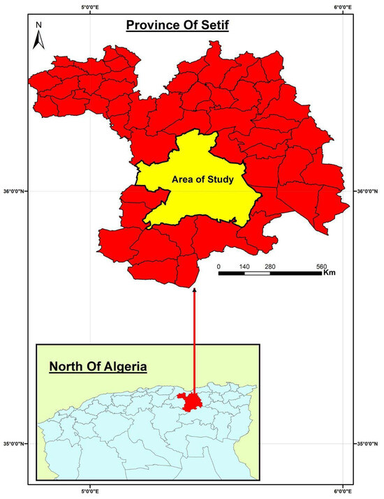 In order to investigate the impact of climate change and urban expansion on péri-urban agriculture in semi-arid regions, the city of Sétif and its southern outskirts were selected as the study area based on two primary factors. The first factor is its geo-climatic characteristics. The study area (see Figure 2) is situated in the eastern highlands of Algeria and is distinguished by a semi-arid climate. The second factor is the rapid urban expansion of Sétif, due to historical and economic considerations, which has directly influenced the regional dynamics of its territory. The study area extends over an area of approximately 1129.69 km2 and had a population of 671,132 inhabitants (see Table 1) in the year of 2020 [12,17,20].