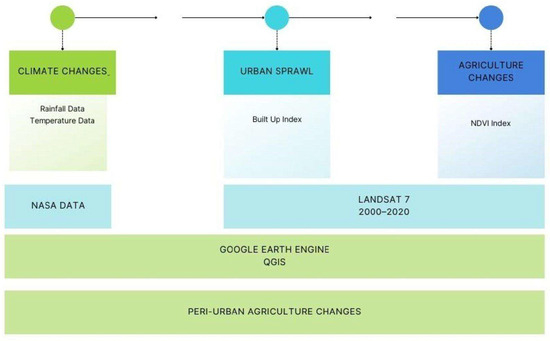This study relied on 2 interconnected key indicators; the first one is population and urban growth (Figure 3), which is considered a significant element in controlling the demand for agricultural products, thus promoting semi-urban agriculture in the region. The second indicator is climatic changes, which also have a major impact on the agricultural pattern based on variations in precipitation levels. The third indicator is the Normalized Difference Vegetation Index (NDVI), which reveals the degree of influence of the aforementioned factors on the change in the agricultural production pattern in the study area.