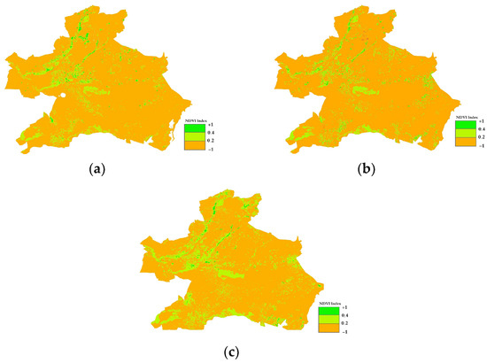 NDVI results in study area in (a) 2000, (b) 2010, and (c) 2020.
