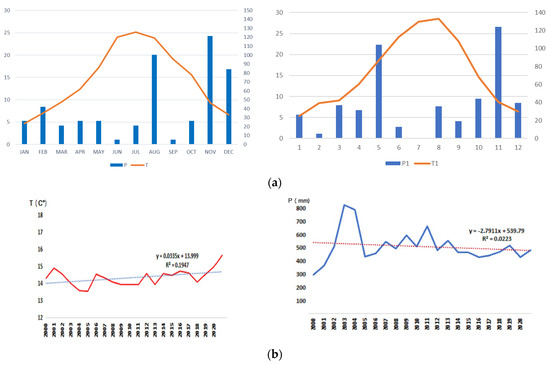 (a) Monthly changes in temperature and precipitation in the 2000–2020 period: (left) 2000 and (right) 2020. (b) Annual changes in temperature and precipitation. (left) Temperature (2000–2020); (right) precipitation (2000–2020).