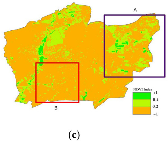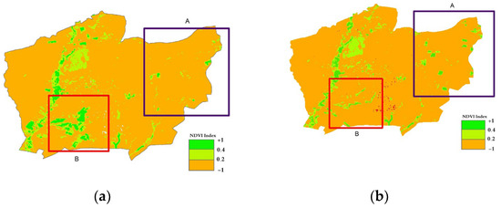 The use of the NDVI (Normalized Difference Vegetation Index) changes allowed us to understand the transformations in agricultural vegetative cover between the years of 2000 and 2020 within the study area. Substantial changes in land use patterns became evident, particularly in the north-eastern (A) and south-western (B) regions of Setif city (see Figure 6). In these areas, the shift in land use has transitioned from cereal cultivation to more intensive open-field agriculture and the construction of plastic greenhouses, particularly in the southern part of the study region.