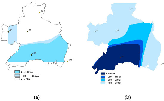 The levels of regular and artesian wells have been affected due to the decline in underground water levels, primarily supplied by seasonal precipitation. The underground water levels have dropped from less than 50 m in the northern areas before 2015 to over 150 m by the end of 2022 (see Figure 7). In contrast, in the southern region, the depth of groundwater levels surpassed 300 m in 2022, as observed in the Ain Oulmene area, while previously, it did not exceed 100 m in extreme cases [31].