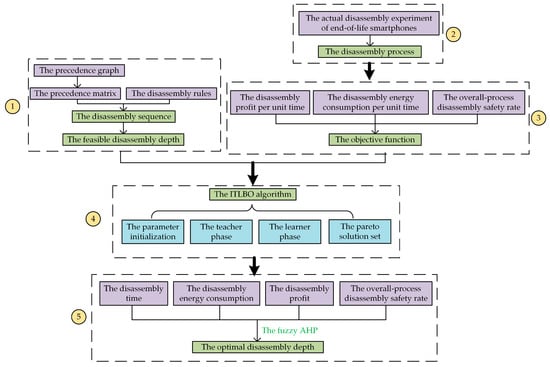 In the first step, the feasible disassembly depth of the EoL smartphones is determined based on the precedence graph and disassembly rules. The second step is to establish a reasonable disassembly process. In the third step, a multi-objective function is established based on the disassembly profit per unit time, the disassembly energy consumption per unit time and the overall safety rate of the disassembly process. In the fourth step, the ITLBO algorithm is proposed to optimize the disassembly depth. The fifth step assesses the disassembly depth in the pareto solution set using fuzzy AHP.