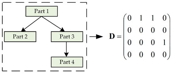 A precedence diagram is commonly used to represent the relationships between parts of the EoL product. For example, Figure 2 shows the precedence relationship between EoL smartphone parts. The precedence constraint between two parts is connected by a unidirectional edge. The precedence matrix is obtained based on the precedence graph. For instance, part 1 is the predecessor of part 2; thus, part 1 is disassembled before part 2, and D12 = 1. Part 4 is not the predecessor of part 1; thus, part 4 is not disassembled before part 1, and D41 = 0.