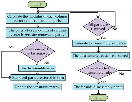 The disassembly sequences are generated based on the precedence graph, the precedence matrix and the disassembly rules. Then, the feasible disassembly depth is obtained by dividing the disassembly stopping points of the above disassembly sequences. The specific process for determining the feasible disassembly depth is shown in Figure 3.