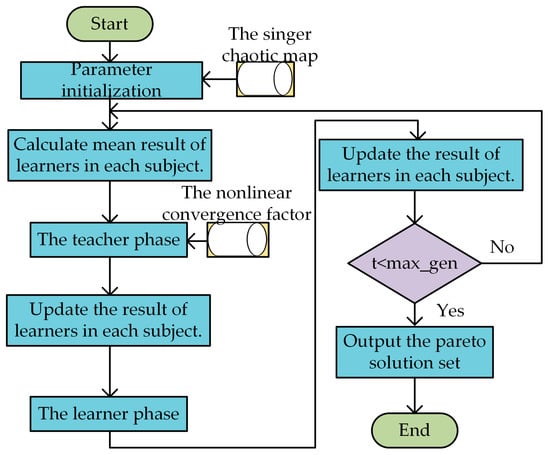 The TLBO algorithm is proposed based on inspiration from the teaching and learning process. Teacher and learners are the two vital components of the algorithm and describe the two basic modes of learning through the teacher phase and the learner phase. Because the TLBO algorithm is only needed to set the initial parameters and the solution process of the TLBO algorithm is simple, the TLBO algorithm is widely used. Therefore, the ITLBO algorithm is proposed for solving the multi-objective disassembly depth optimization problem of EoL smartphones in this section. In order to avoid falling into the local optimum, the Singer chaotic map is used in the population initialization of the ITLBO algorithm. In the teacher phase of the ITLBO algorithm, the nonlinear convergence factor is used to increase the searchability and solution accuracy. The pareto solution set is used to obtain the disassembly depth that can consider multiple objectives of the EoL smartphones. The flow chart of the ITLBO algorithm is shown in Figure 5.