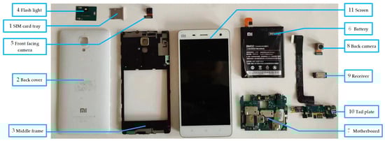 A reasonable disassembly process can improve the accuracy of the optimization model. Thus, it is important to establish a reasonable disassembly process. In this section, the disassembly process is built by analyzing the actual disassembly experiment for EoL smartphones. The specific disassembly process for EoL smartphones is shown in Figure 4.