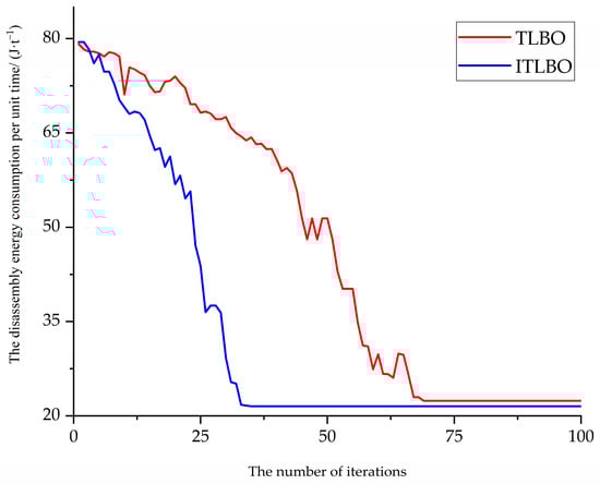 During the process of searching for the optimal disassembly energy consumption per unit time, it can be seen from Figure 10 that the ITLBO algorithm tends to converge in the 35th generation, while the TLBO algorithm tends to converge in the 70th generation. Compared with the TLBO algorithm, the convergence speed of the ITLBO algorithm is increased by 50.00%. Moreover, it can be seen from Figure 10 that the minimum disassembly energy consumption per unit time obtained by the TLBO algorithm is 22.3968 J·t−1, while the minimum disassembly energy consumption per unit time obtained by the ITLBO algorithm is 21.5224 J·t−1. Compared with the TLBO algorithm, the minimum disassembly energy consumption per unit time by the ITLBO algorithm is reduced by 3.91%.