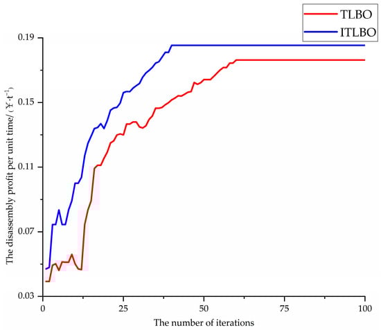 In the process of searching for the optimal disassembly profit per unit time, it can be seen from Figure 11 that the ITLBO algorithm tends to converge in the 40th generation, while the TLBO algorithm tends to converge in the 60th generation. Compared with the TLBO algorithm, the convergence speed of the ITLBO algorithm increased by 33.33%. Moreover, it can be seen from Figure 11 that the maximum disassembly profit per unit time obtained by the TLBO algorithm is 0.1764 ¥·t−1, while the maximum disassembly profit per unit time obtained by the ITLBO algorithm is 0.1854 ¥·t−1. Compared with the TLBO algorithm, the maximum disassembly profit per unit of time obtained by the ITLBO algorithm increased by 5.10%.