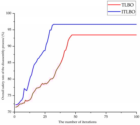 In the process of searching for the optimal overall safety rate of the disassembly process, it can be seen from Figure 12 that the ITLBO algorithm tends to converge in the 32nd generation, while the TLBO algorithm tends to converge in the 46th generation. Compared with the TLBO algorithm, the convergence speed of the ITLBO algorithm increased by 30.43%. Moreover, it can be seen from Figure 12 that the maximum overall disassembly safety rate obtained by the TLBO algorithm is 93.45%, while the maximum overall disassembly safety rate obtained by the ITLBO algorithm is 96.67%. Compared with the TLBO algorithm, the maximum overall disassembly safety rate of the ITLBO algorithm increased by 3.45%. In summary, the convergence speed and solution accuracy of the ITLBO algorithm are superior to those of the TLBO algorithm.