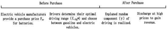 For V2G electric vehicles, the driver’s behavior can also be divided into two phases: pre-purchase and post-purchase. Firstly, in the pre-purchase phase, the supplier offers a selling price, which includes a price premium for V2G electric vehicles compared to conventional gasoline vehicles. Subsequently, the driver makes a choice between gasoline vehicles and V2G electric vehicles based on their expected utility and then decides on the planned driving distance based on relevant marginal costs and benefits. Finally, in the post-purchase phase, the driver adds variables for unplanned trips to the planned mileage and includes the V2G discharging revenue they can participate in. These factors together constitute the driver’s ultimate utility. Therefore, for V2G electric vehicles, in addition to meeting the sequence of traditional vehicles, owners need to discharge when electricity prices are high in order to obtain revenue, which typically results in higher overall utility for V2G electric vehicle owners. The process is illustrated in Figure 2: