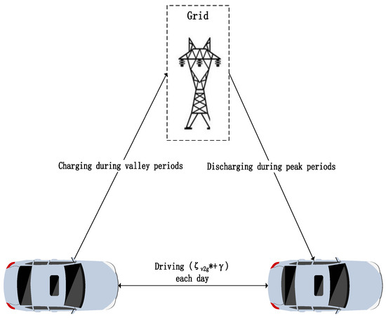 Owners of V2G electric vehicles generate daily income by discharging their vehicles. Specifically, they charge their vehicles during off-peak nighttime hours while absorbing renewable energy, commute as usual during the day, and discharge during peak hours. This strategy is employed to achieve peak load management and generate income. The specific process is illustrated in Figure 3.