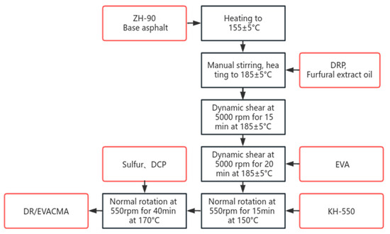Firstly, the matrix bitumen was heated to 160 ± 5 °C, and desulfurized rubber powder and furfural extract oil were added, during which time the mixture was stirred manually to prevent accumulation. The temperature was raised to 180–190 °C, and the bitumen was sheared with a high-speed shear at 1000 r/min for 3 min, followed by 15 min at 5000 r/min, with EVA added to keep the speed constant, and shearing was carried out for 20 min. The sheared, modified bitumen was then cooled to 150 °C and placed in a temperature-controlled electrically heated jacket. KH-550 was added at 155 °C and stirred for 15 min. Finally, the temperature was raised to 170 °C, and sulfur and diisopropyl peroxide (DCP) were added and stirred for 40 min to obtain desulfurized rubber powder/EVA-composite-modified asphalt (DR/EVACMA). The preparation process is shown in Figure 1 and Figure 2.
