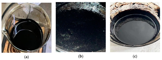 Processing of asphalt. (a) Matrix asphalt. (b) Matrix asphalt after shear completion and (c) after mixing completion.